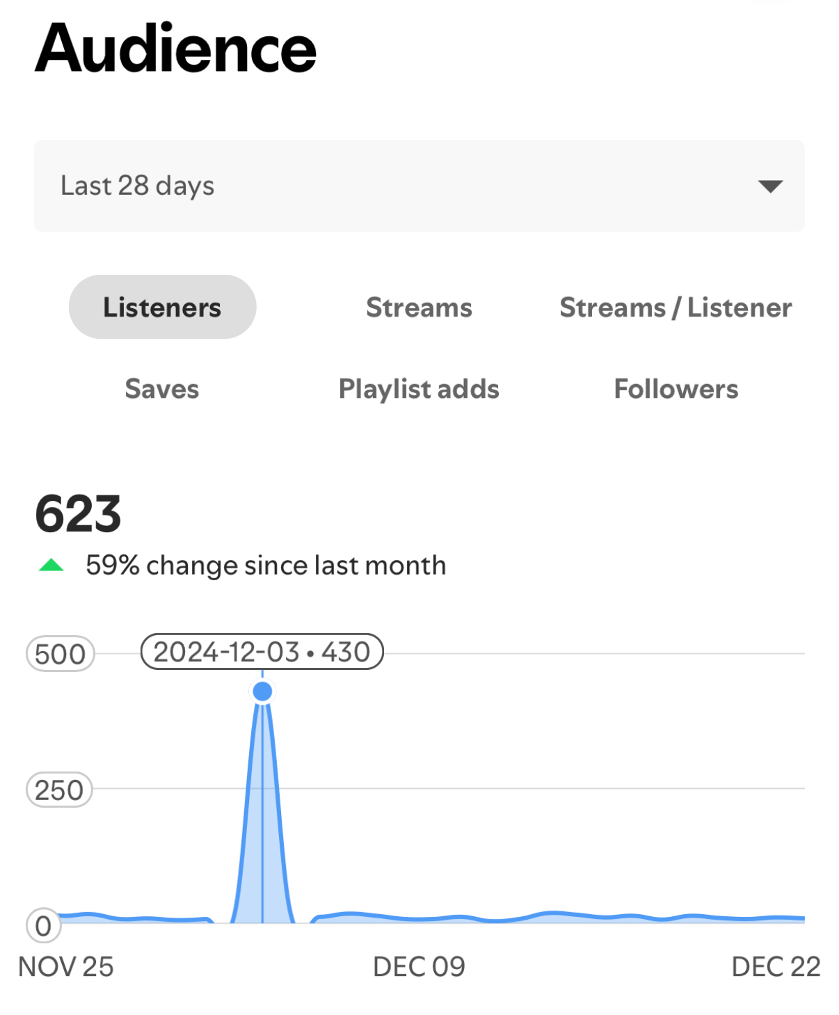 This is my listeners chart for the last 4 weeks. A song of mine (“things I might say to you”, a collaboration with Badyears) got scraped for a Chartmob playlist, and suddenly got almost exactly 1,000 players over 72 hours. I got nothing out of this as an artist other than a to-do to report Chartmob to Spotify, and my “monthly listener” count now looks artificially high until roughly January 4, after which it will likely return to measly low-triple-digits.