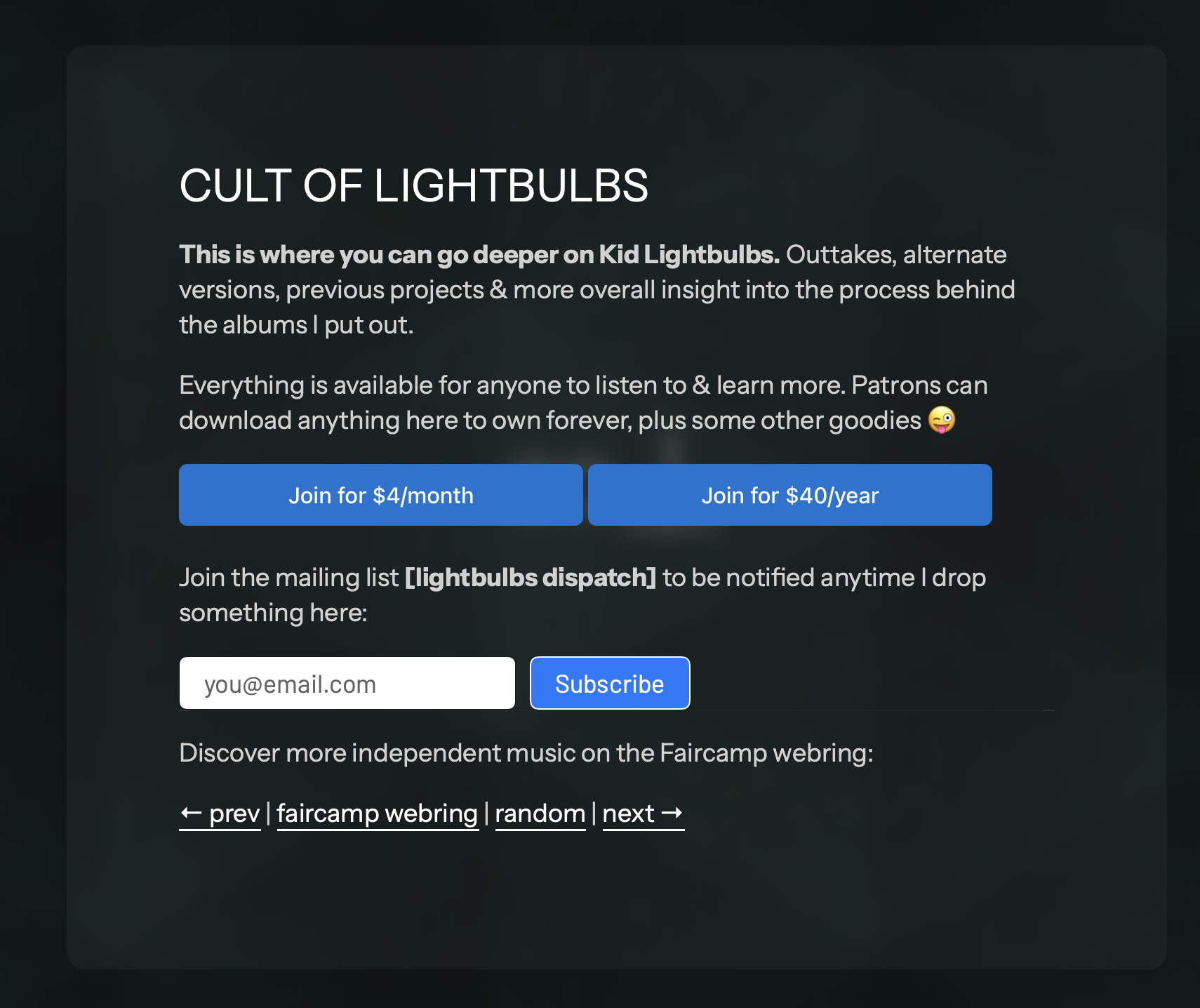 That’s the whole thing in a nutshell. I hope you found this at least mildly interesting, and/or might consider subscribing if you like my music & musical journey. If you’re a fellow artist and are looking for a way to have fans support you without the weird incentives and lock-in of a big tech company (or several), it’s worth considering this approach.