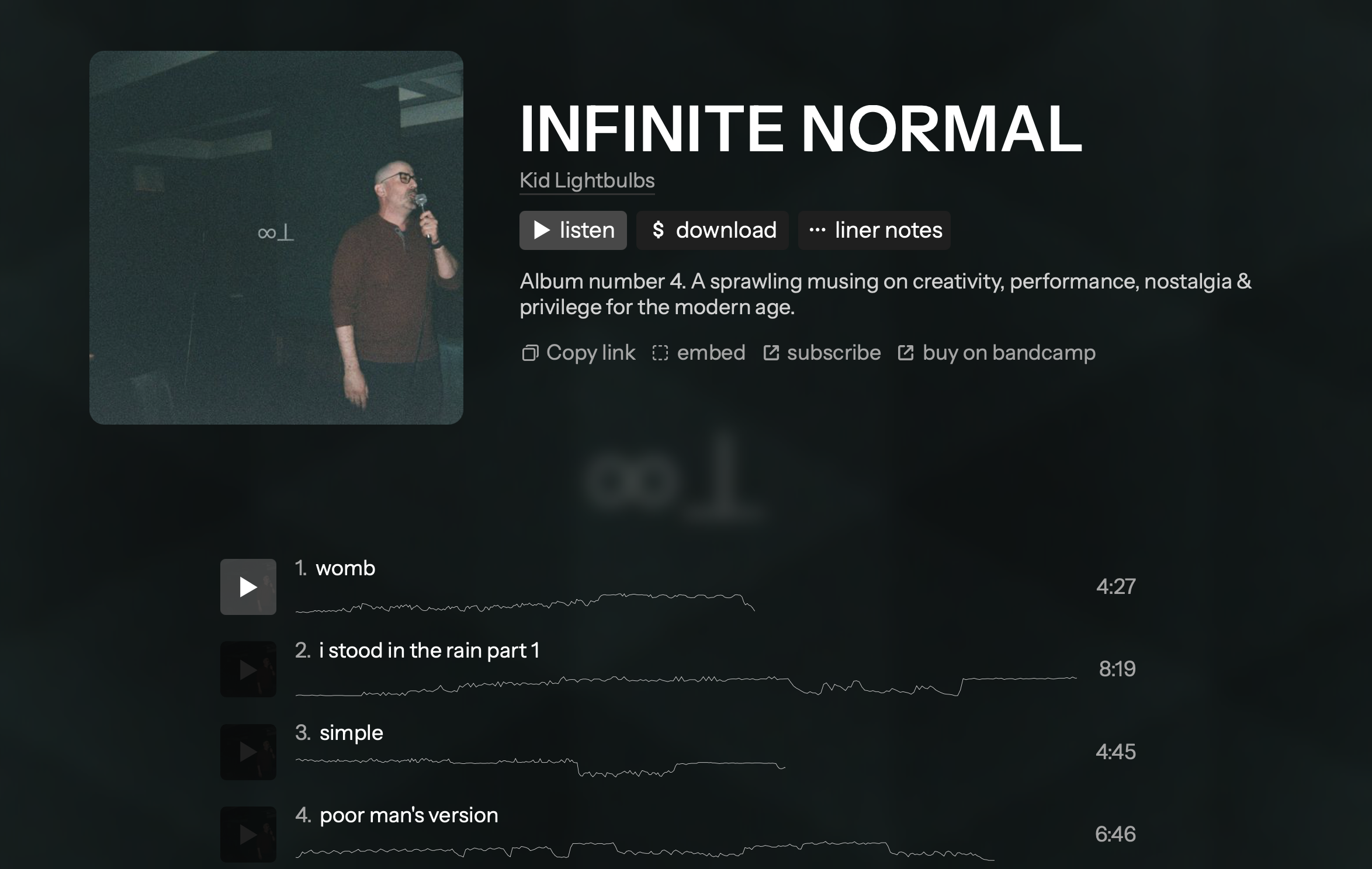 - All my public releases are available with a soft paycurtain. I don’t require payment, but encourage it via Stripe or by subscribing, or offering a link out to Bandcamp if you’d rather buy the release there.