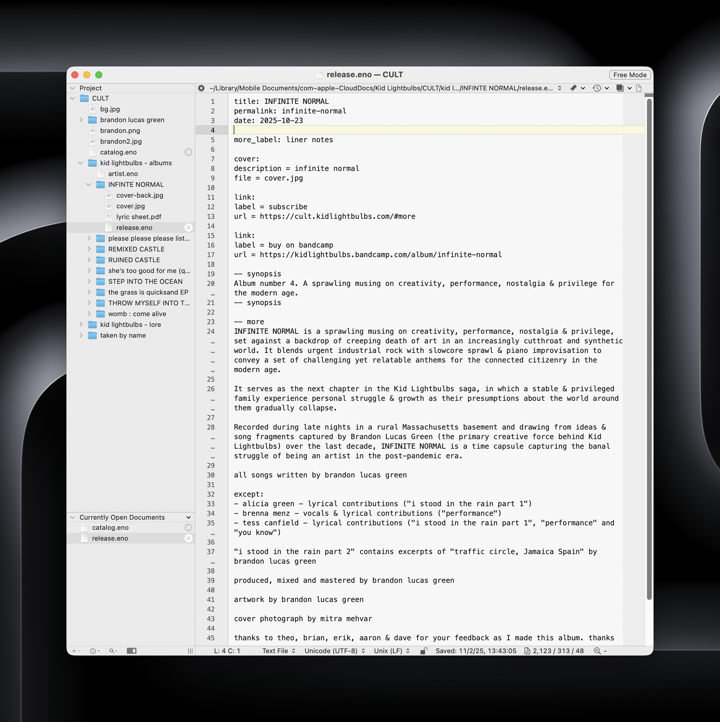 Here’s an example of what the .eno metadata file looks like for my latest album INFINITE NORMAL: