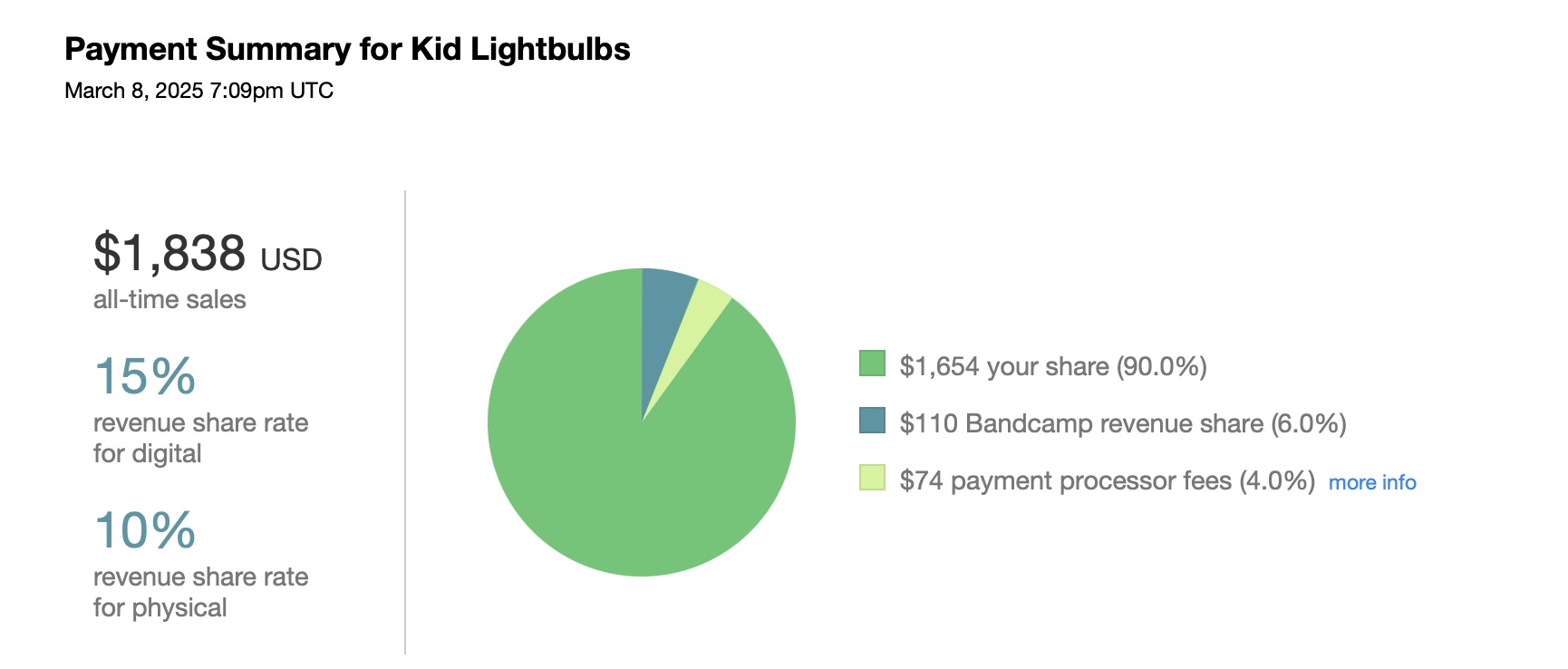 Turns out, thanks to Bandcamp Friday, Bandcamp itself isn’t taking much more out of my sales than PayPal/Stripe/Visa/Mastercard/Amex at this point.
